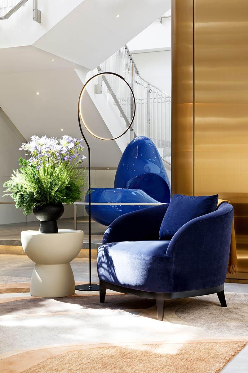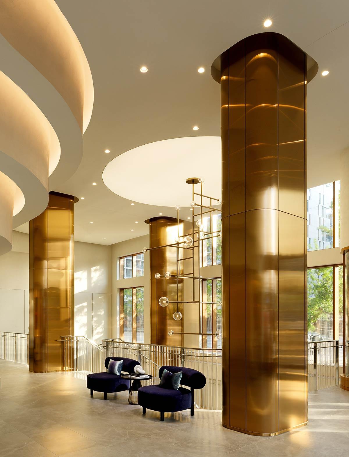 Severni i južni lobi služe kao impresivno iskustvo dolaska. Ovde, visoki plafoni i bronzani stubovi na četiri sprata deluju kao blistava vertikalna sidra, bacajući zlatnu toplinu po celom prostoru. Nameštaj po meri, probrana kanadska umetnička dela i pažljivo integrisano osvetljenje pojačavaju vezu sa mestom, istovremeno postižući nivo prefinjenosti koji govori o globalnom senzibilitetu. Veštačko krovno svetlo prati inspirativne radove Džejmsa Turela – kombinovano sa upečatljivom rasvetom, lobi Akvalune je remek-delo koje se stalno menja.