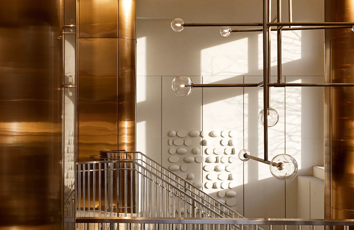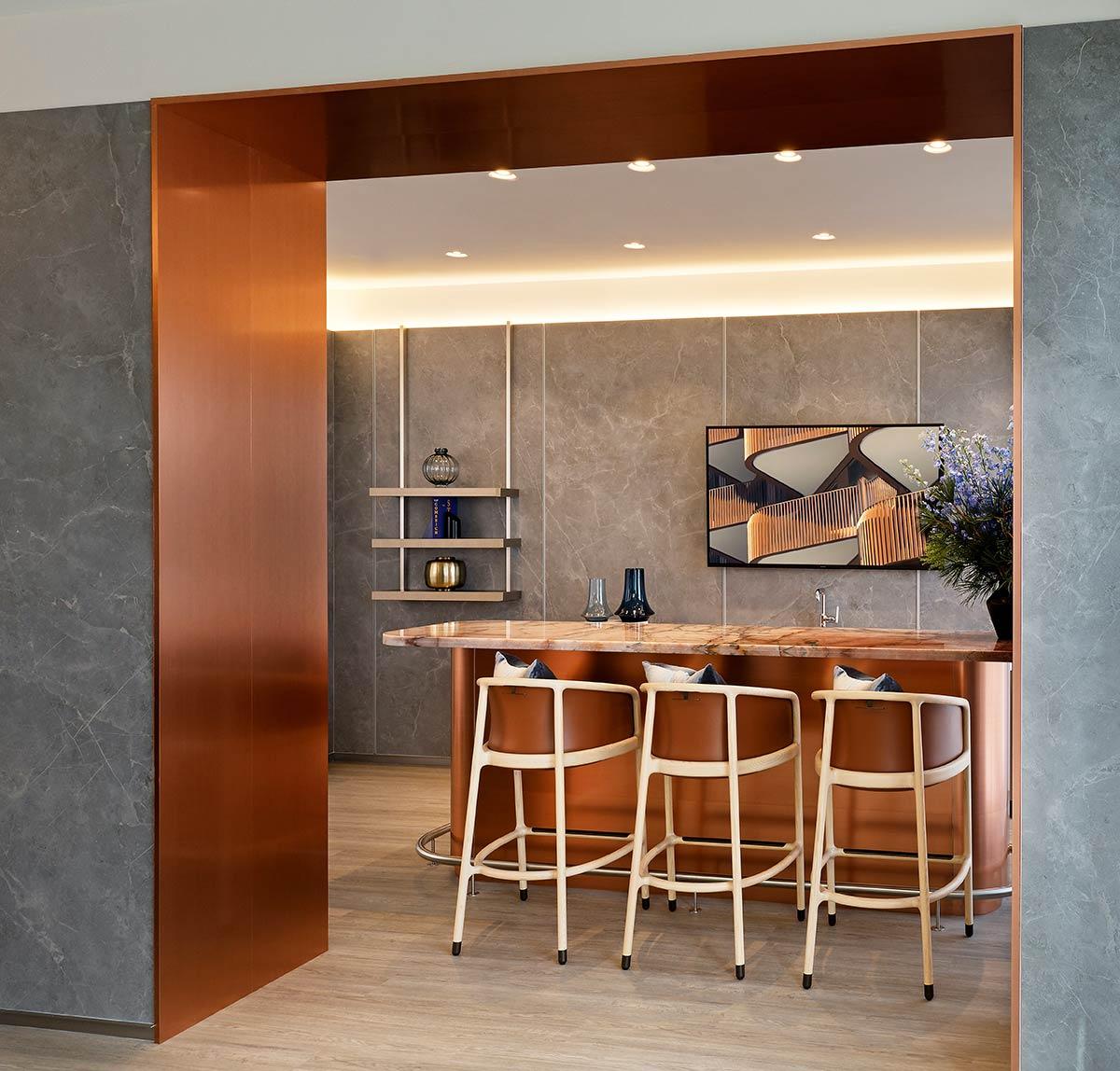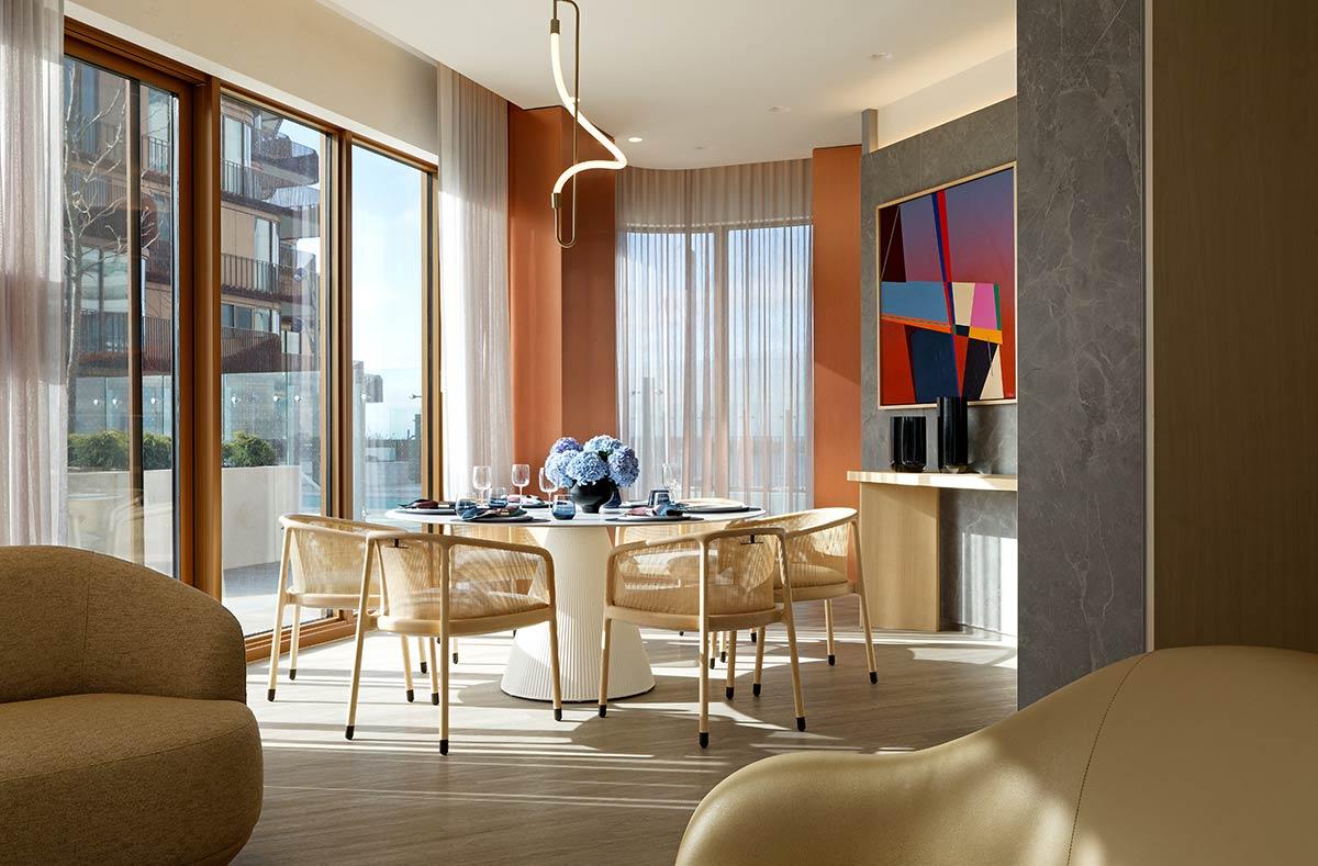 Prostorije za zabavu nastavljaju ovu viziju kroz holistički pristup materijalnosti i iskustvu. Salon na šestom spratu, koji se nalazi u zatvorenom i na otvorenom, nudi panoramski pogled na jezero Ontario, ublažen providnom draperijom koja filtrira prirodno svetlo bez odvajanja od pejzaža.
